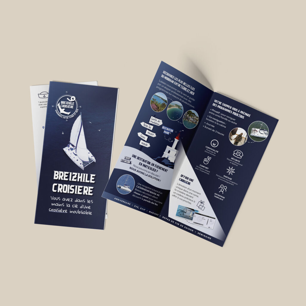 Réalisation et mise en page d’un dépliant 2 volets pour Breizhile Croisière. Une entreprise qui propose des randonnées entre terre et mer dans le Morbihan, en utilisant les couleurs déjà établies et montrant des illustrations représentant cette activité.